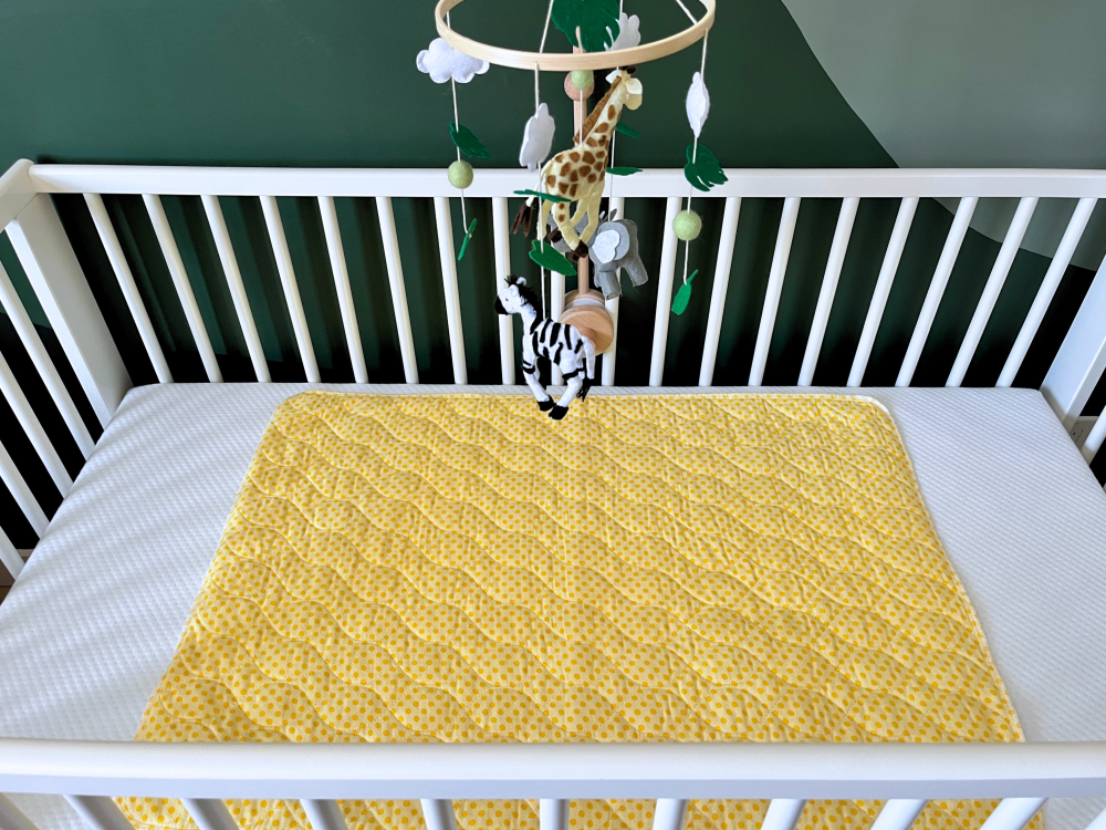 Our Bébé d'amour large-format quilted mat is designed to protect the mattress from nighttime accidents. It can also be used as a play mat on the floor or carpet. Its triple-layer construction ensures excellent absorbency while effectively protecting surfaces. Designed with a waterproof nylon backing and a soft printed cotton top, this mat combines practicality and comfort. The padded interior, made of polyester and viscose, provides a plush feel while locking in moisture. Ideal for use at home or on the go, it adapts easily to any situation.